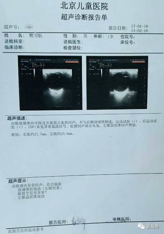 北京儿童医院超声诊断报告单显示:航航双眼球内异常回声,结合临床玻璃体轻混浊(左眼较重)等。