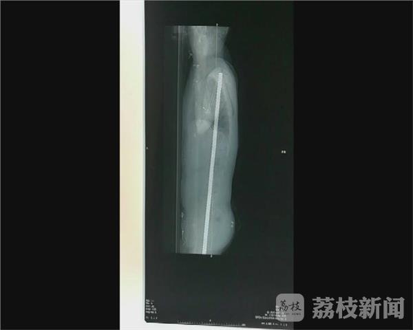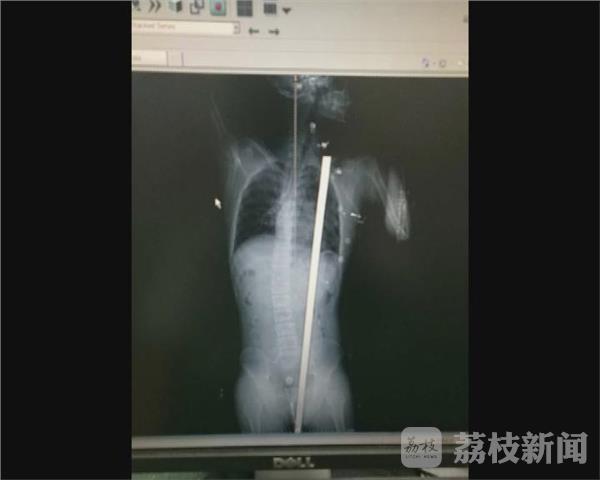 看到这情况,医生赶紧给这位伤者做检查,发现这根还留在体内的钢筋是从伤者臀部插入,经过腹腔、胸腔,直接上穿到左侧锁骨位置。无锡市人民医院急诊科 徐进宇:“急症给他做了CT ,发现铁杆是完全贯穿了整个身体,。但他运气好的是 ,从CT来看, 好像是从脾胃肾之间穿过, 腹腔胸腔感觉好像是擦着心脏过去,把整个肺贯穿, 病情比较重 。 ”