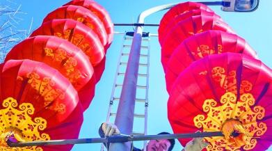 1月14日,工人师傅在悬挂大红灯笼。随着2017年新春佳节的临近,梁溪区在辖区内的各条主干道路口悬挂大红灯笼,营造春节气氛,迎接即将到来的农历丁酉新年。