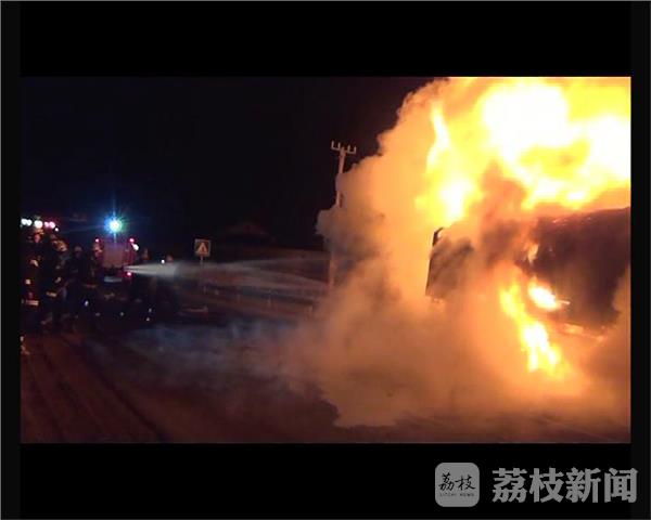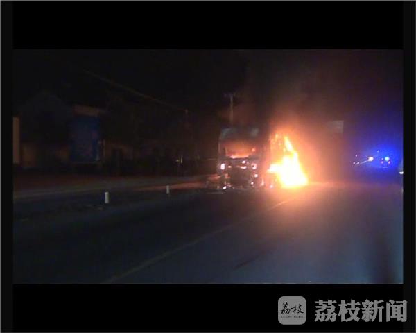 近日,江苏省淮安市盱眙县消防中队接到指挥中心调度,称盱眙县河桥镇王庄一半挂车起火,车上载满货物。接到报警后,盱眙中队迅速出动2车10人赶往现场处置。