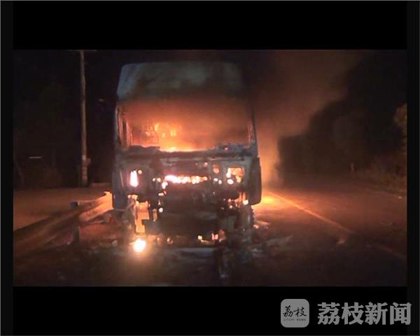 消防员经侦查发现,现场火势正处于猛烈燃烧阶段,驾驶室已完全燃烧,火势已蔓延至前半截车身,车底因漏油引燃全部轮胎,情况十分危急。指挥员了解情况后迅速下令出两支水枪从车体两侧对火势进行打击,经过20分钟的扑救火势已熄灭,为防止复燃,消防员又对车身整体进行降温处理。10分后,在确认无复燃可能后,中队收整器材归队。