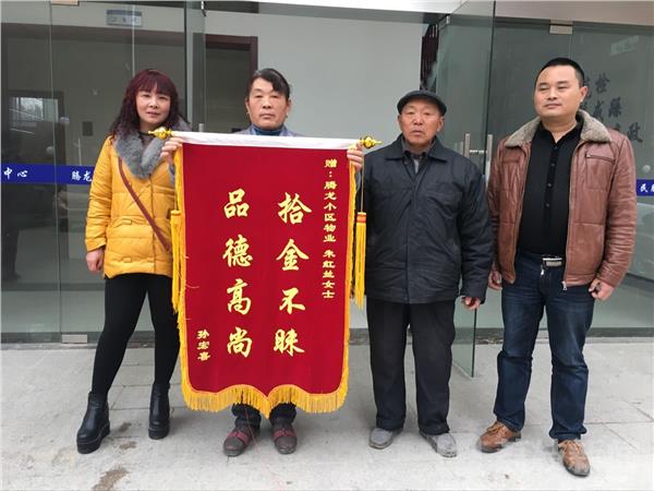 2017年1月17日下午2点多,泰州市高港区腾龙御园小区物业保洁员朱红兰在工作时捡到一万元现金,家境不富裕的她没有动心,而是立即打电话向物业主管报告,并原地等待失主认领。见到失而复得的巨款,失主孙宏喜激动不已,当场拿出现金表示感谢,被朱红兰婉拒。18日下午,孙老汉做了一面锦旗送到小区物业办公室,以此表扬朱红兰拾金不昧的精神。