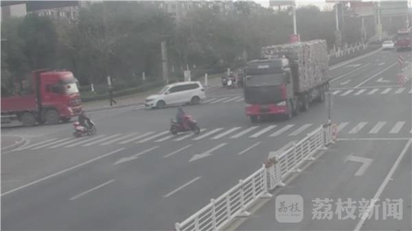 监控视频显示,在江陵东路与泾陵路路口,满载着货物的大货车沿江陵东路由东向西行驶,电动车则由北向南行驶,两车在路口发生碰撞。从监控判断,大货车在路口没有减速并且还闯了红灯。