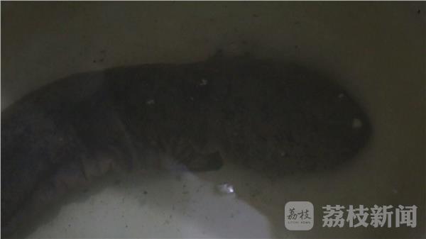 当晚,记者就跟随民警赶到郭先生家,只见这被钓上来的四脚怪鱼在鱼缸里纹丝不动,全身漆黑、头部扁平、四肢爪子清晰可见。郭先生的父亲郭忠兵告诉民警,其实这条怪鱼是在上个月28号的下午3点钟左右,在家北边的新洋港河边上钓上来。