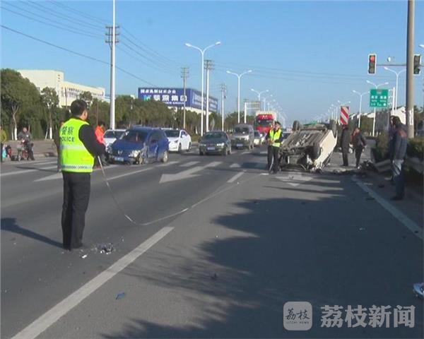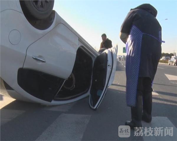 近日,一辆蓝色轿车行驶到宁通公路六合灵岩段十字路口,停车等信号灯时,后面一辆银白色轿车突然撞上来,将等红灯的蓝色轿车撞飞。银白色轿车180度大旋转,然后四轮朝天,司机被困在驾驶室,路人发现立即将其救了出来,所幸并无大碍。