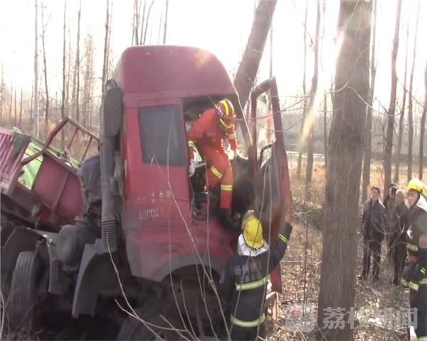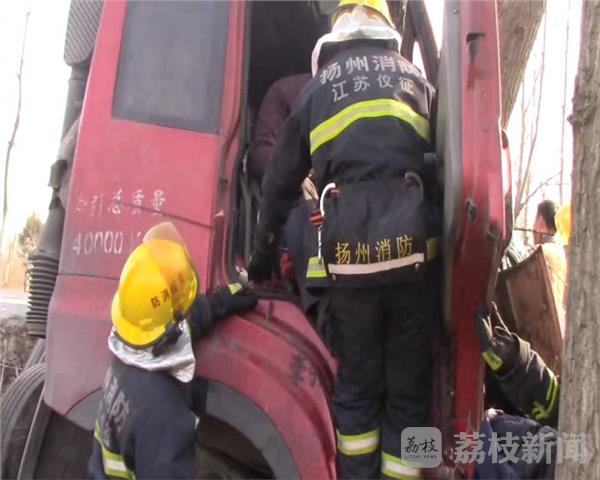1月21日下午两点多,扬州仪征市月塘镇境内一条乡间公路上,一辆装载31吨货物的大货车,疑因避让不及与一电动三轮车相撞,货车头撞上路边大树,严重变形,司机被困车内,情况紧急。当地公安、消防、120急救等部门接到报警,迅速赶赴现场施救。