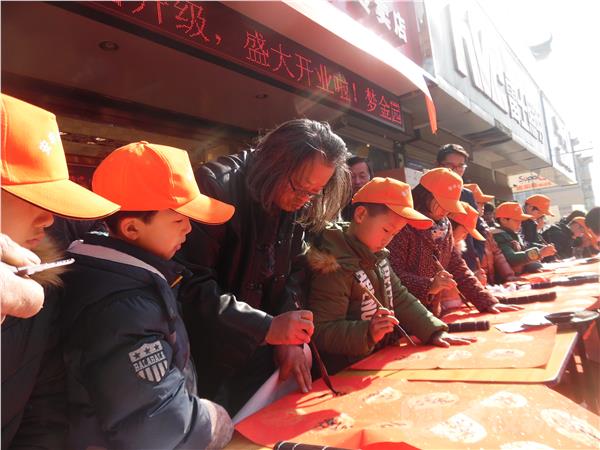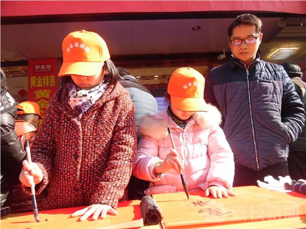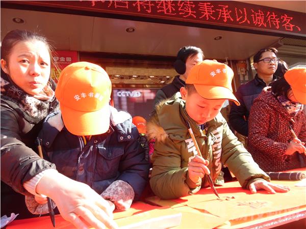 当天下午活动在振安桥北侧举行,小朋友们在写字台上一字排开、挥毫泼墨,小女孩陈宇琪寒假刚刚参加写春联学习班,看着自己写的一幅幅春联被周围的爷爷奶奶、叔叔阿姨喜笑颜开带回家,她感觉很有成就感,她说今天有幸参加书画院的写春联活动,能够用学习的书法给广大居民写春联他感觉很自豪。