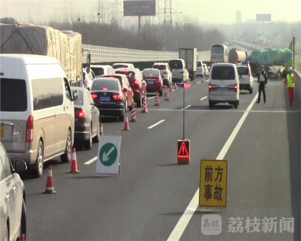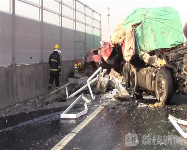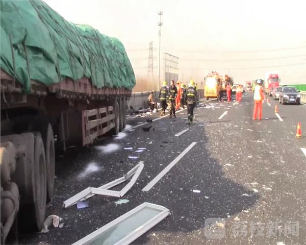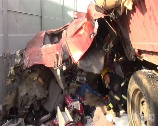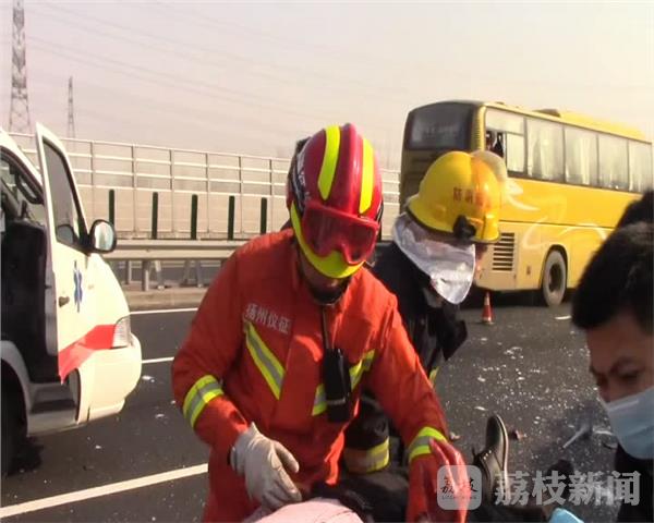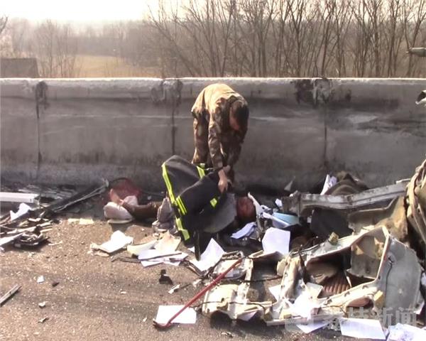 1月22日上午9时许,沪陕高速扬州仪征段发生一起惨烈车祸,一辆重型半挂车与轿车发生追尾,造成半挂车驾驶人身亡,轿车上两人受伤,情况紧急。当地高速交警、消防、120急救等部门接警,迅速赶往现场救援。轿车上的受伤女子躺在地上,现场救援人员拿来消防服等衣物,给她御寒,加油鼓劲,直至送上救护车。