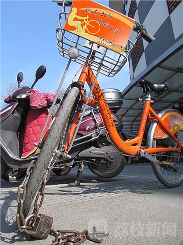 公共自行车本是为了方便市民出行而设置,却有人为了个人利益,拿备用锁绕前轮,再拔掉钥匙,将公共自行车变成了“私家车”。在南京长乐路箍桶巷口发现这一怪现象,人行道上一辆公用自行车,被私人加用铁链把公共自行车锁住,成为了自己的私人自行车,这种不文明行为,反而让不少市民不方便了。