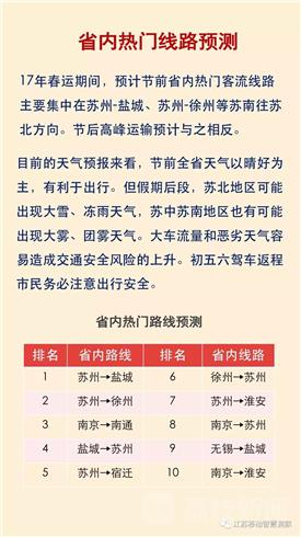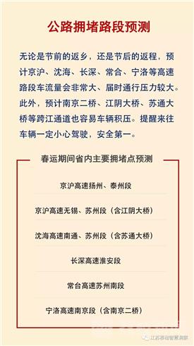 无论是节前返乡还是节后返程,预计京沪、沈海、长深、常合、宁洛等高速路段车流量会非常大;此外,南京长江二桥、江阴大桥、苏通大桥等跨江通道也容易车辆积压。