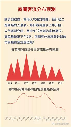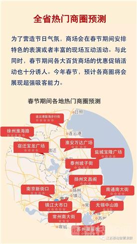 热门商圈方面,南京新街口、苏州观前街、扬州文昌阁、淮安万达广场、徐州淮安路等10大商圈的吸客能力令人期待,预计每日客流量从上午开始,人气逐渐变旺,至中午12点时到达高位。客流高位将一直持续至下午五点左右。因此提醒市民前往这些商圈用餐时需提前订位,并确认好停车信息。