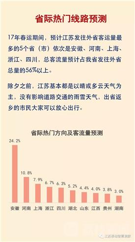 热门线路方面,17年春运期间,预计江苏发往外省客运量最多的5个省依次是安徽、河南、上海、浙江、和四川,总客流量预计占我省发往外省总量的56%以上;省内热门客流线路主要集中苏州至盐城、苏州至徐州等苏南王苏北方向,节后则与之相反。