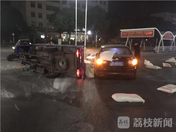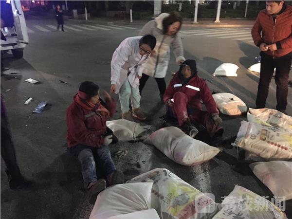 荔枝通讯员在现场看到,三轮车侧翻在马路中间,夫妻俩躺着地上痛苦地呻吟着,面粉撒一地,三轮车车门和碎玻璃脱落在地上。旁边一辆扬州牌照的小轿车引擎盖被撞瘪,右侧大灯脱落有十米开外,车内两个气囊全部打开,几袋面粉掉在汽车上。