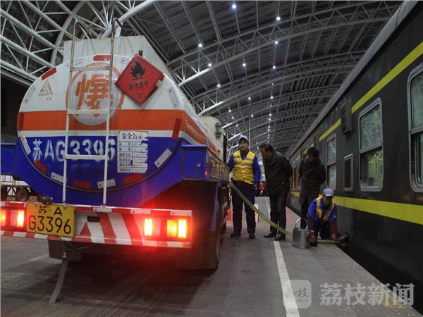 1日27日夜晚20点45分,列车缓缓驶入站台,列车停稳收到作业确认通知后,上海铁路物资有限公司南京分公司朱双宝和工友分别拖起长长的橡胶油管,快速地奔向列车的注油口,拧阀、插管、加油,所有动作一气呵成,大约用了12分钟。列车里的乘客并不知道车窗外还有忙碌作业的加油工。