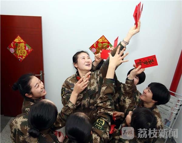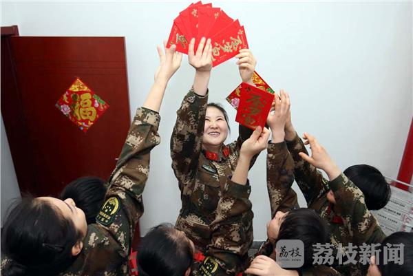 1月27日,除夕当天,正当武警江苏总队文工队的女兵们正沉浸在班里玩微信“抢红包”的游戏中时,新兵陈书画看到班长田慧拿着压岁包进来,突然喊了句“班长发红包啦”,大家纷纷放下手机将班长团团围住。淘气的田慧站在放平的凳子上高高举起手中的红包吆呼着“快来抢啊!”张尧瑶、徐可欣和赵琦三人占着个子高的优势先抢到了红包,抢过了一个个打开来看里面包的都是她们的剪纸。在大家都在埋怨班长骗人的时候,田班长语重心长地说:“我们都是家里的宝贝闺女,过年了,不要只是沉迷于‘抢红包’,也要多和家里打打电话视视频,不要让父母太想念了!”