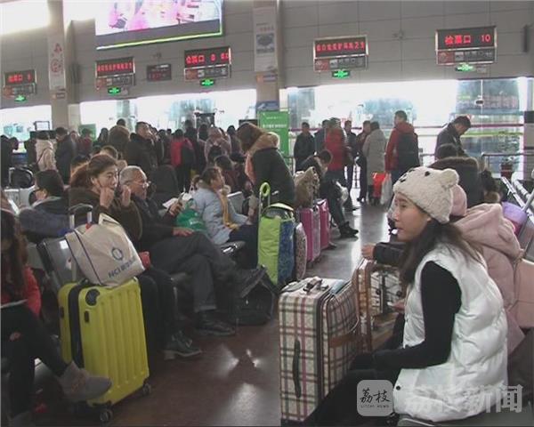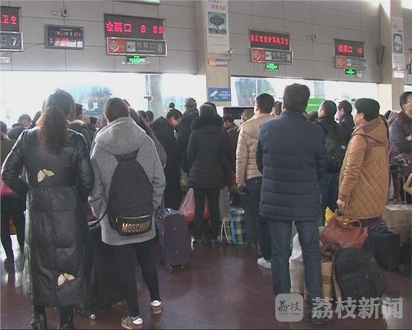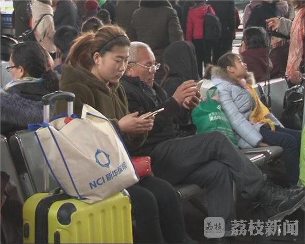今天早上八点钟,荔枝新闻记者在宿迁市汽车长途客运站看到,大厅里已经有不少乘客正在候车,检票口也排起了长长的队伍。虽然拖着重重的行李箱比较辛苦,但很多人的脸上都掩饰不住回家探亲的喜悦。