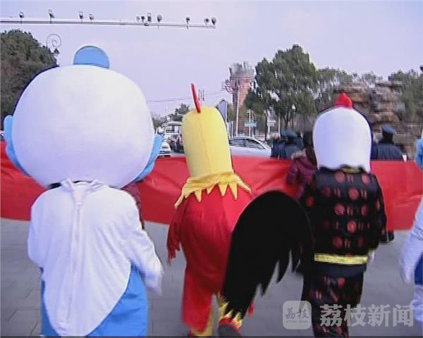 今年是鸡年,一只身着红色衣服、头顶红色鸡冠、翘着黑色尾巴的大公鸡,与9只活泼可爱的凤城河吉祥物卡通凤宝走在了巡游队伍的最前面。