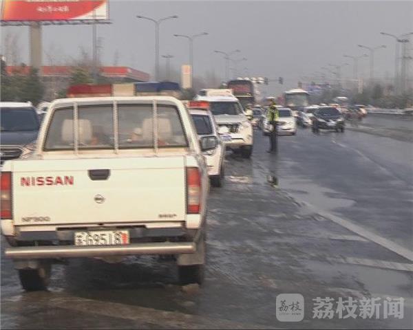 南城公安检查站站长茆长海:“因为昨天下雨,造成路面结冰湿滑。早上我们从8点上班的时候看到路面山有很多车辆积压,我们就一直在这边协助海州三大队指挥交通。”
