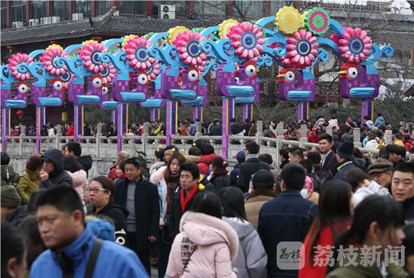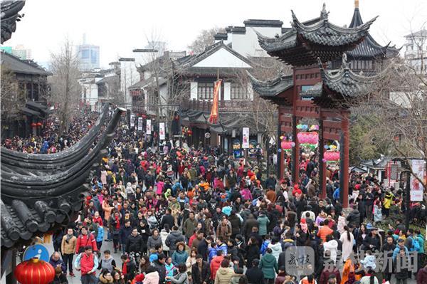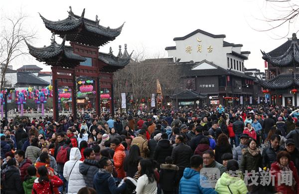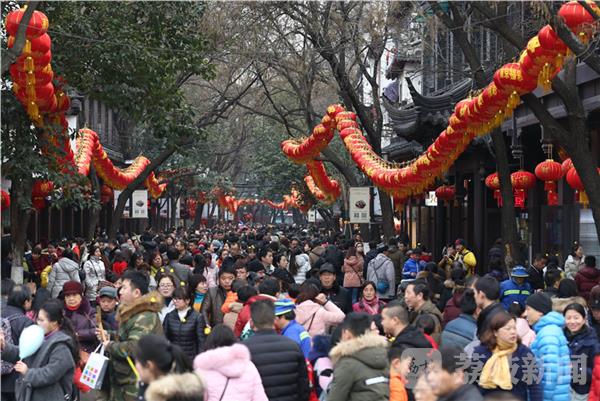 2017年2月2日,游客在南京夫子庙参观游览。据统计,2017年“春节”黄金周期间,南京市共接待国内外旅游者533万人次,同比增长9.6%;实现旅游收入55亿元,同比增长13.3%。全市纳入统计的18 家4A级以上景区(点)共接待游客449万人次,同比增长7%。旅游住宿设施接待趋于饱和,星级饭店平均客房出租率达69%。