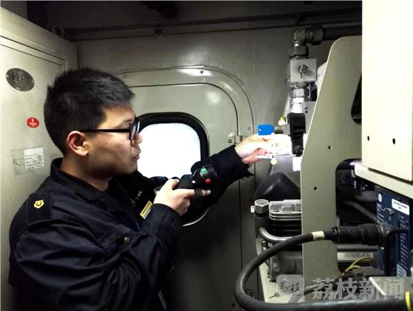 9:15,赵鹏飞来到了南京东乘务员出乘室签到,学习当天的文件通知等。前天大年二十九,他值乘了K5571次客车,并于大年三十在单位宿舍休息一天。12:40,他和主司机、也是他的入路老师郭俊一同登上和谐号电力机车车头。“大年三十、初一、初二,有些临客停开,我们是见缝插针,暂时担当几趟货车的值乘。”赵鹏飞登上了机车车头,开始了当天的工作。