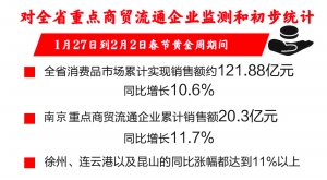 2月2日,现代快报记者从江苏省商务厅获悉,根据对全省重点商贸流通企业监测和初步统计,1月27日到2月2日春节黄金周期间,全省消费品市场累计实现销售额约121.88亿元,同比增长10.6%。来自南京市商务局数据显示,节日7天重点商贸流通企业累计销售额20.3亿元,同比增长11.7 %。