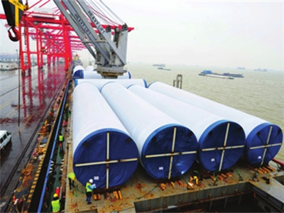近日,满载着4根32段风电塔筒的长航宁海轮在江苏省太仓港集装箱码头完成吊装,经由太仓港出口泰国林查班港。由南京中建五洲工程装备有限公司制造的风力发电塔筒去年中标总装机容量67.5MW的泰国GNP风电塔筒制造项目,选用18台Gamesa G1142.0MW和15台2.1MW机型,单套重量达512吨,轮毂高度达153米,系亚洲目前最高的风力发电塔筒。