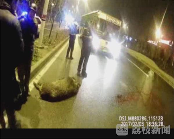 野猪横穿马路时,被行车记录仪拍到了身影,就在这时一辆大客车经过,将野猪撞飞。当民警赶到现场时,一头身长约一米多的野猪已经倒在下机动车道上,不少好奇的市民都停下车围观。相比围观市民的好奇,撞了野猪的客车驾驶员可是吓出了一身的冷汗。客车驾驶员说,当时他正常行驶,野猪突然从车身一侧出现,他来不及刹车撞了上去,野猪当场身亡。
