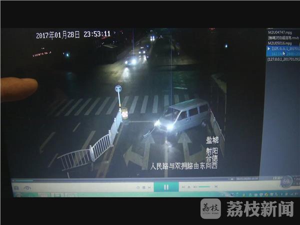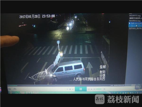 农历正月初一的深夜11点50分左右,一辆由东向西的面包车行驶到射阳县城人民路与双拥路交汇的十字路口时,突然方向失控撞向路中央的隔离护栏,车辆就地旋转了一百八十度,事故导致几节隔离护栏扭曲变形损坏,占据由西向东的一股车道,而肇事车辆驾驶员并没有停车报警,反而逆向行驶逃离了现场。2月7日下午,射阳警方依据道路监控拍摄的视频录象,依法传唤了肇事车辆驾驶员,并对其作出了行政处罚。