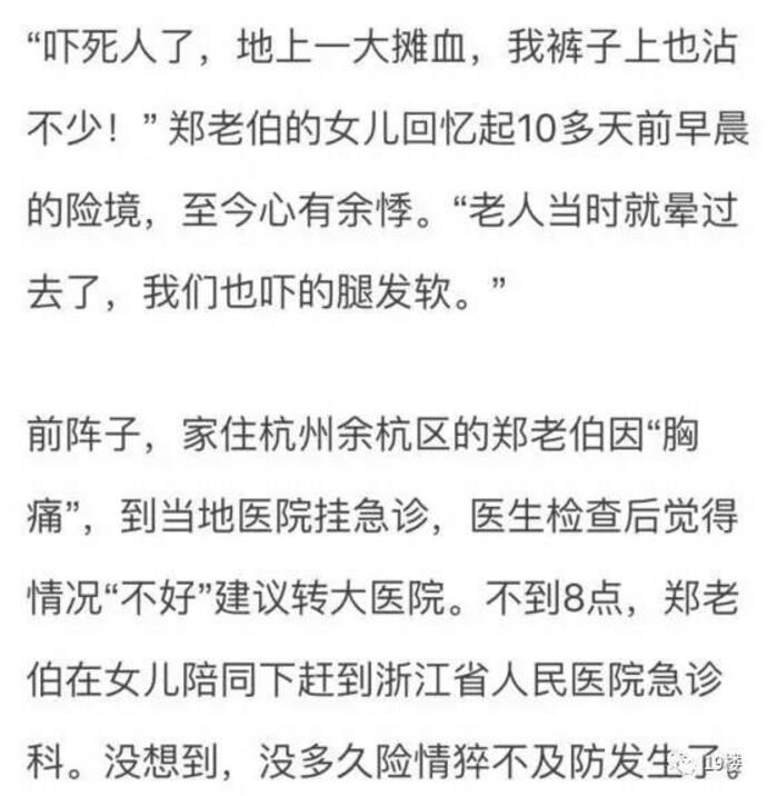 郑老伯随后就去了附近的医院,没有发现东西,让他先回家,若疼痛未减轻再来医院。痛了两天后逐渐减轻,之后没什么大的不舒服,郑老伯也就没有在意,直到这次胸口隐隐作痛,然后大出血。