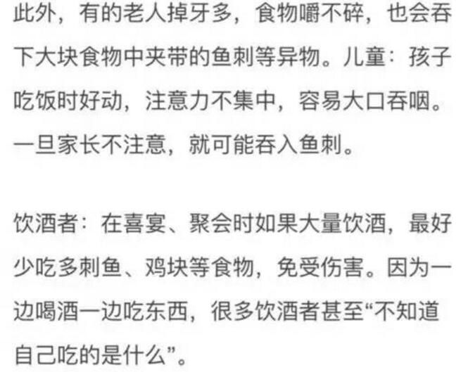 说到吃鱼,很少没被刺过,大医院的耳鼻咽喉科门诊忙时每天至少一、二十个来取鱼刺,浙江省人民医院耳鼻咽喉科主任苏立众、血管外科主任蒋劲松根据临床经验,认为这些人应尤其注意:老人:老人咽部粘膜感觉迟钝,吃饭时如果不注意,很容易吞入异物。