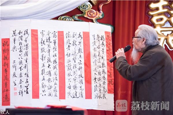 江苏南京老人夏笠的书法作品悬挂在舞台上,传递着春节的吉庆气息,他当场赋诗以表达对故乡对亲人的情义。乡亲们一边品尝美食,一边欣赏文艺表演,舞台上有熟悉的民歌联唱,有少女时尚舞蹈的活泼身姿,有名家戏曲对唱等等,节目精彩纷呈。