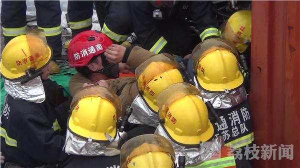 消防官兵将头盔戴在被困驾驶员头上,防止驾驶员再次受伤,救援人员先利用液压破拆工具对变形的驾驶室进行扩张,同时合力将车门掰开腾出救援空间。