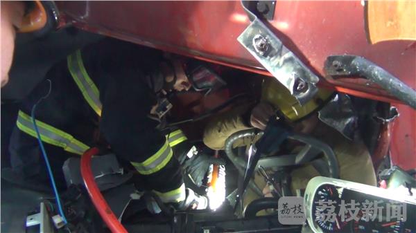 由于救援空间狭小,指挥员一人爬入驾驶室中用扩张钳和液压顶杆对驾驶室内部进行扩张,以便将被困驾驶员腿部救出。