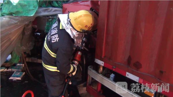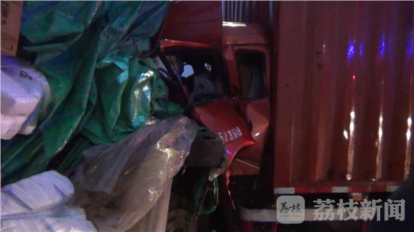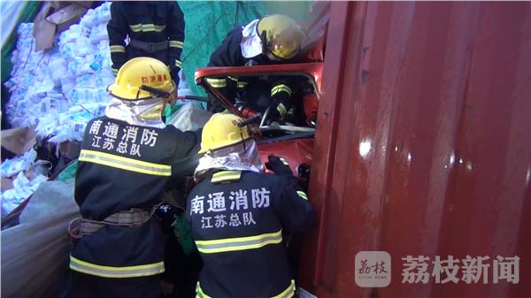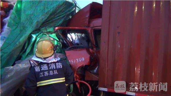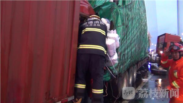 记者到达现场时发现,事故现场最后面一辆集装箱货车与前方半挂车由于发生猛烈碰撞,导致司机被卡在驾驶室内。消防指挥员迅速下令侦查现场情况,同时向集装箱车驾驶员询问其身体状况,经勘查集装箱货车车头严重变形,车门无法打开,指挥员下令使用液压破拆工具对驾驶室进行破拆。