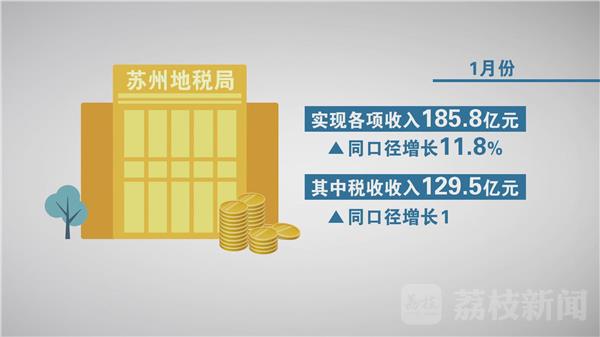 据苏州地税局最新统计,1月份,实现各项收入185.8亿元,同口径增长11.8%,其中税收收入129.5亿元,同口径增长18.6%。