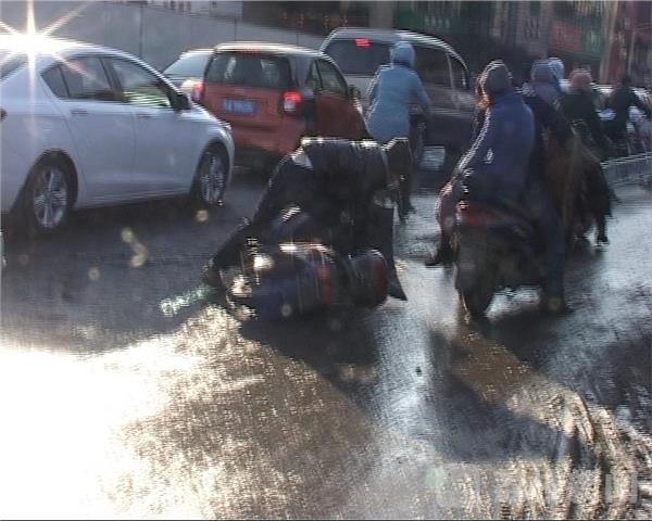 早高峰期间,湖南路上车水马龙,人来人往,但是整条马路几乎都结了冰,成了一个溜冰场,骑车人行驶在上面真的是如履薄冰,稍有不慎,便连人带车跌倒。从早上7点半到9点,至少有40个人摔倒。好在摔倒的市民并没有受伤,起来后小心翼翼推着车走了。那么,这里为什么会大面积结冰呢?一位路口执勤的辅警表示,湖南路部分路段还在施工,施工单位夜间施工时在路上留下了不少污泥,凌晨时分,他们用洒水车对路面冲洗,但是由于今天凌晨室外的最低气温达到了零下4度,所以刚冲洗后就结了冰。