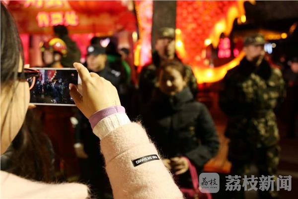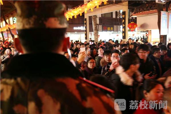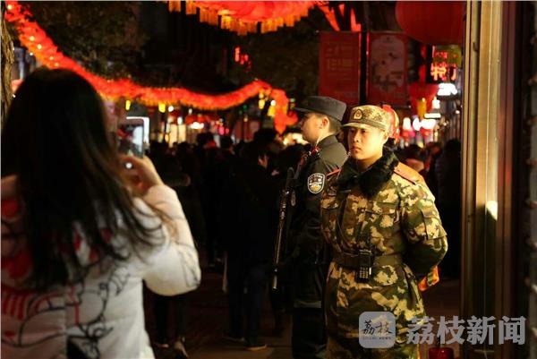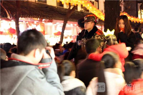 2月10日,正月十四,南京迎来了元宵节前客流的小高峰。南京夫子庙“第31届中国·秦淮灯会”现场,灯美、人美、兵更美,正在担负灯会安保任务的武警江苏总队执勤官兵引来了游客的超高回头率,游客竞相将军人的英姿“装进”自己的手机和相机里。