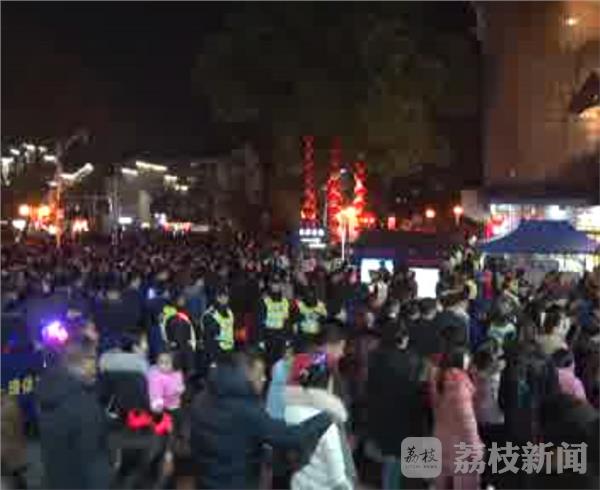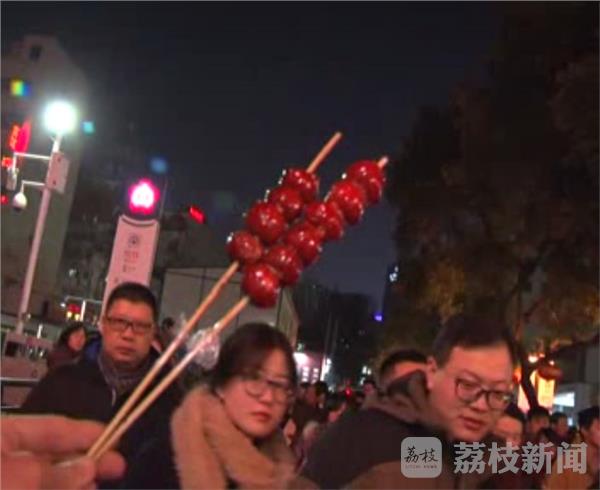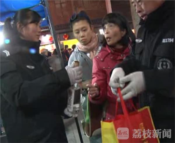 晚上7点,观灯市民或游客像潮水般涌向夫子庙,整个景区满眼望过去全是人,民警严阵以待,不放过任何一个违禁物品。你看,这几位手上的糖葫芦串就被民警没收了。执勤民警解释说,糖葫芦串短串带尖的,扎到自己扎到别人都不好。再来看这边,带着宠物犬和高度白酒的市民都被查出不得携带这些进入景区。安检人员说宠物犬因为景区人流量太大,容易激发兽性咬人。