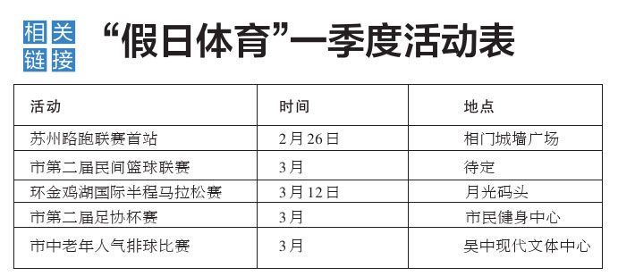 前八届“假日体育”活动均利用中秋假日集中举行,今年首次贯穿全年。“希望让这一品牌活动跨度更长、参与面更广,唱响全民健身的‘四季歌’,”市体育局局长周志芳介绍,今年,“假日体育”将一共举办34项大型健身活动。其中一季度以“迎新”为主题,举办苏州路跑联赛首站、民间篮球联赛等。二季度以“户外健身”为主题,举行美丽乡村健康行、风筝节、城市定向联赛等。三、四季度则分别以“全民健身日”和“全民健身大评选”为主题,举办青少年足球赛、篮球嘉年华、广场舞大赛、体育文化周等众多赛事和活动。