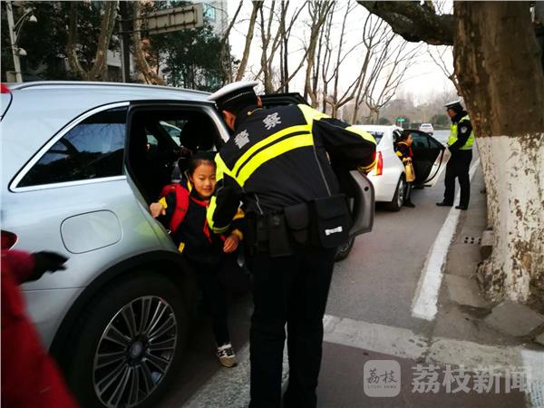 开学第一天,南京交警一大队的护学岗民警特地比平时来的早了一些,警容严整迎接学生开学。疏导和维护校园周边交通秩序,保障学生们出入校园的平安是护学岗的首要职责。通过现场指挥疏导减少单车逗留时间,加快车流行驶速度,减少车辆的积压,避免形成拥堵节点。长年累月的路口执勤经验使得护学岗的民警能分辨出哪些是接送小孩的车辆,哪些是过往的车辆。招呼家长们的送接车辆停在指定区域,打开车门扶小朋友下车,再帮孩子拎书包直到把他们送到志愿者手中或者亲自护送到学校门口,转身立马再回到路口疏导交通,如此反复,整个流程流畅熟练一气呵成,与志愿者的配合也是相当默契。