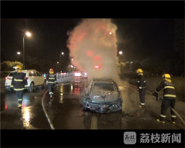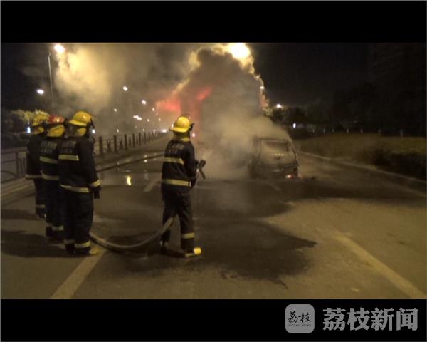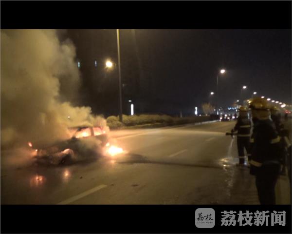 2月13日凌晨0时55分许,位于连云港市海州区海连西路上,一辆轿车在行驶过程中突然起火燃烧,连云港市消防支队海昌路中队官兵闻讯后立即赶往现场扑救火灾。