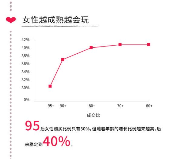 相比90后,80后消费成交人数占比为39.56%。相比90后,80后的消费能力更强,在所有年龄层情趣消费金额的占比为43.1%。