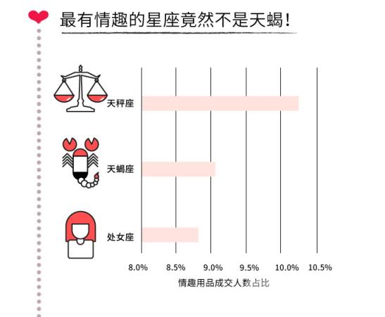 从阿里健康研究中心提供的情趣用品网购数据来看,2016年最具情趣消费能力的星座是天秤座,在情趣消费中以10.3%的消费占比排名第一,天蝎座则9%屈居其后,看似保守的处女座8.7%位列第三。这一结论,刷新了人们对于天秤座和处女座的认知。