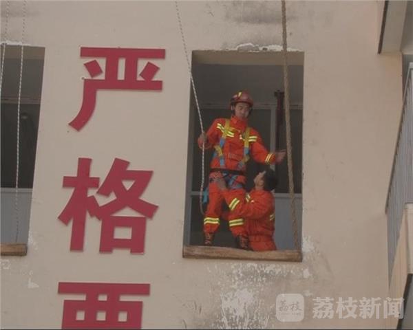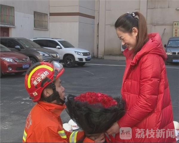 此时,在三楼窗口的张春雨,穿着橘色消防服,在战友的协助下“索降”至地面,手里还捧着56朵玫瑰来到了袁静静的面前。