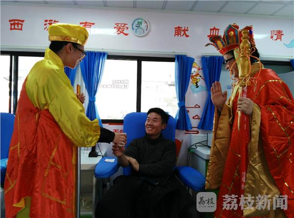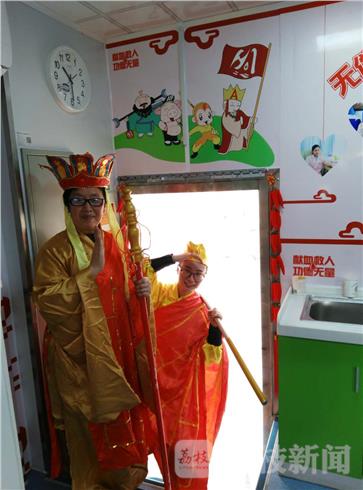 2月14日是一年中最浪漫的日子。这天下午,笔者在淮安街头看到了一座以西游文化为主题的爱心献血屋。走进献血屋,发现里面充满了西游记文化,西游记人物的卡通图片传递着 “西游有爱,献血有情”。有志愿者扮演成唐僧师徒,向过往行人宣传无偿献血。