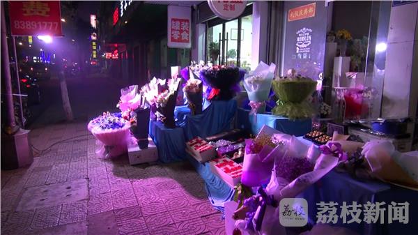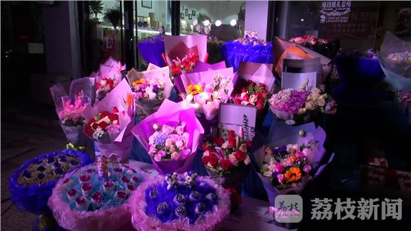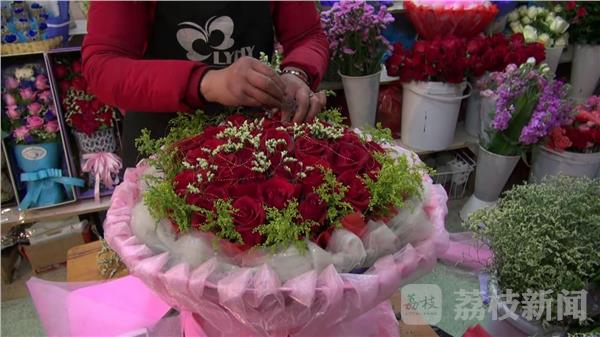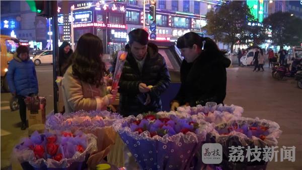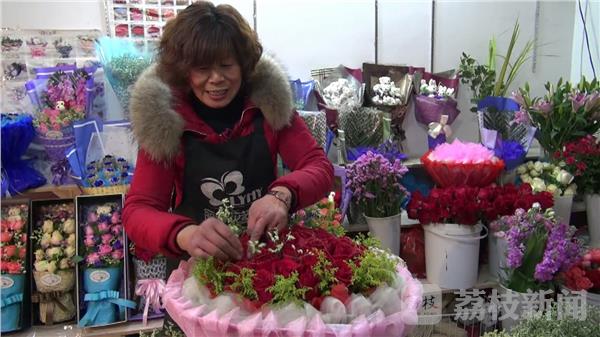 在盐城市大丰市区,记者看到卖花的生意火爆,有的花店从昨天下午到14号晚上还在加班加点的赶制捧花,记者在大丰市区一家叫春燕的花店了解到,他家今年生意比去年要多卖出一倍的数量。老板介绍:为了情人节,他家在一个星期前就从外地组织各种花卉空运到大丰市场,老板还介绍了今年主打的还是手捧花和盒装花。记者随后到市区的主要路段看到,有情侣、有刚结婚不久的夫妻买花送给对方,好多的摊主和店主都高兴了笑成了像一朵花。