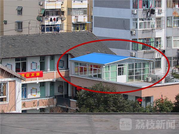 14日中午,笔者登上明城墙,远眺南京城美景。一眼就发现老门东附近,一所学校二楼平台上,搭着一间几十平方米的彩钢瓦玻璃违建房,与周围环境格格不入,大煞风景。