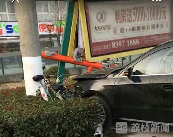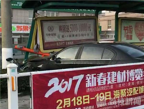 2017年2月15日上午7:20分,大丰区黄海路常新桥往西500米,富贵园小区门口,发生一起车祸。一辆汽车突然失去控制,直接驶向路边,冲向栏杆,造成成片路边栏杆被撞倒并连根拔起,然后车辆继续失控冲向公交站亭,造成公交站亭被撞及部分公用自行车辆损坏。