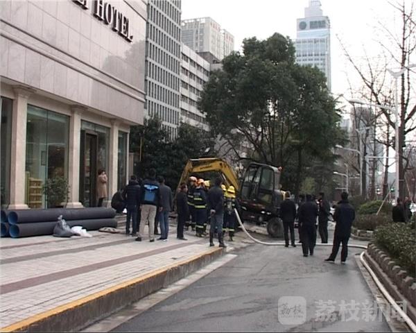 荔枝新闻记者赶到现场时,只见漏气点正在不停地往外冒气,现场散发着刺鼻的气味。施工点旁边的这家酒店因为下水道不通畅,便请来施工单位前来施工,不料施工人员开着挖掘机上阵,一铲子下去,挖断了一根直径为60毫米的天然气管道,顿时天然气直往外喷。很快,接到报警的110民警和近在咫尺的鼓楼消防大队人员迅速到场,拉起警戒线,做好救援准备。随后,燃气公司工作人员赶到现场抢修,2个小时后,泄漏点被维修好,市民供气恢复了正常。