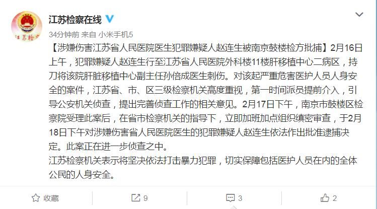 据@江苏检察在线,2月16日上午,犯罪嫌疑人赵连生行至江苏省人民医院外科楼11楼肝移植中心二病区,持刀将该院肝脏移植中心副主任孙倍成医生刺伤。